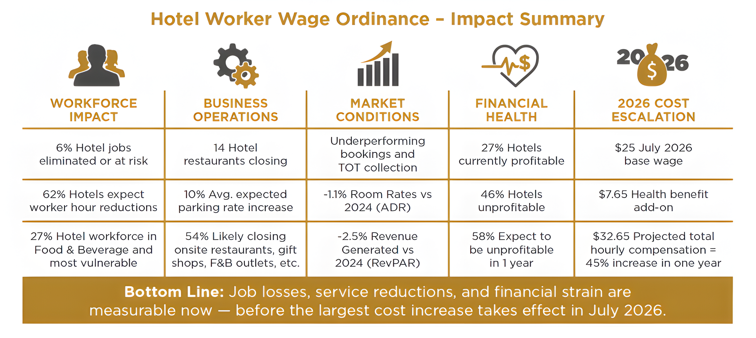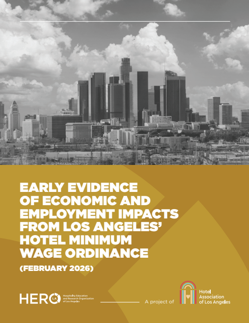 A survey conducted by Hospitality Education and Research Organization (HERO), a project of the Hotel Association of Los Angeles, found hotels lost 6 percent of jobs following implementation of the Hotel Worker Minimum Wage Ordinance in September 2025. Additionally, 62 percent of surveyed hotels said they plan to reduce staff hours in 2026.